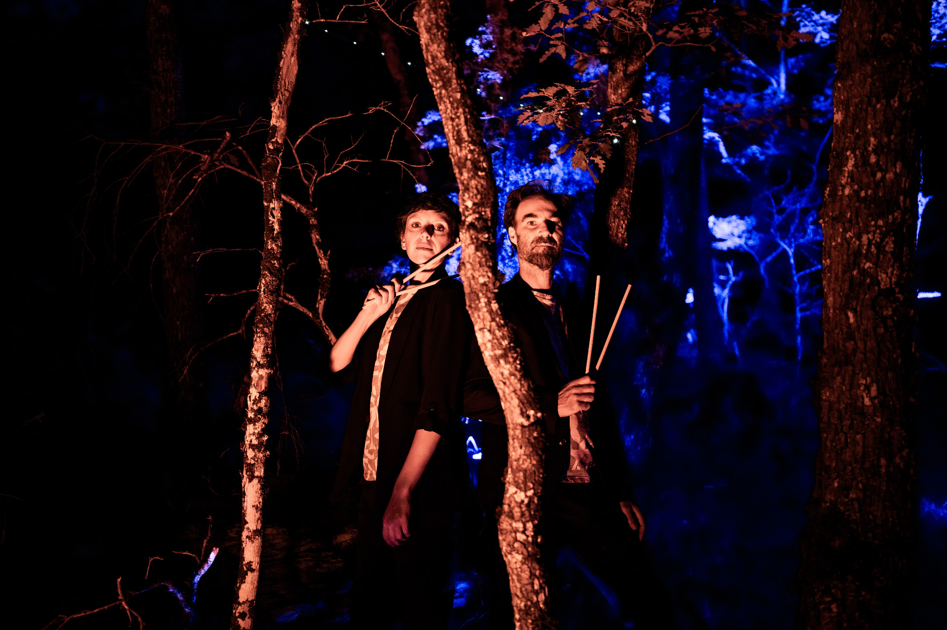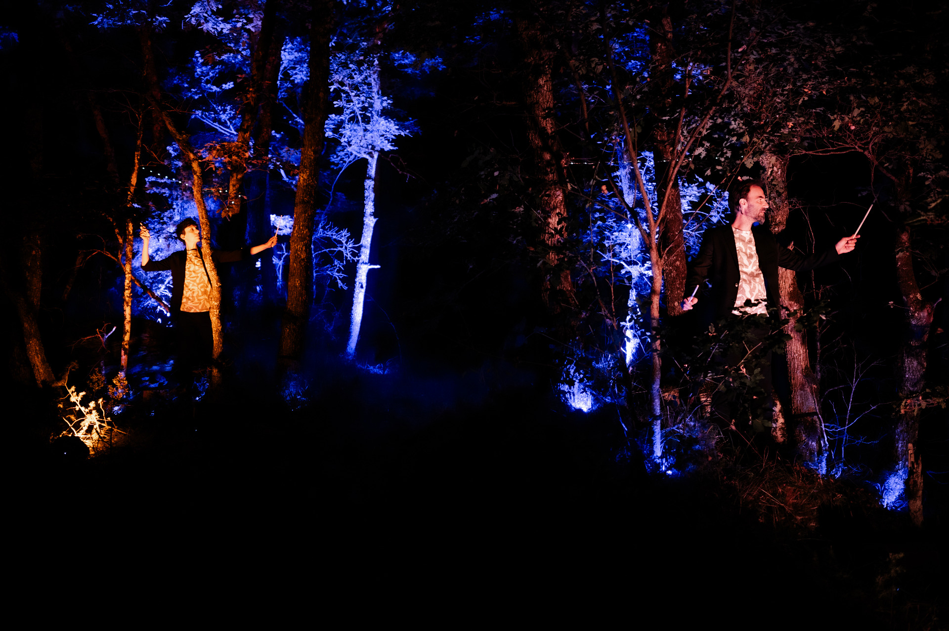 instruments. Le mouvement est à l'origine du son par le jeu percussif des baguettes ou à mains nues sur les troncs et les branches. À chaque concert, les musiciens s'adaptent à leur nouveau terrain de jeu.